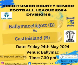 Neighbours Ballymacelligott and Castleisland Desmonds met in this Division 6 shield game. Seven players from the U21 team that played on Thursday night took part in this Senior B game on Friday, May 24th. It is a testament to their commitment and loyalty to the club that they again showed up and played their part.