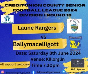 Round 10 of The County League. Ballymacelligott started without 10 of the starting fifteen in Round 1 of The County League. The ten that stepped up did so with courage, rose to the challenge, and played a mighty second half.