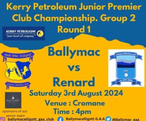 Best wishes to our senior team, who play in Round 1 of the Kerry Petroleum Junior Premier Championship on Saturday, August 3rd, at 4 pm in Cromane Eircode: V93 TK61.