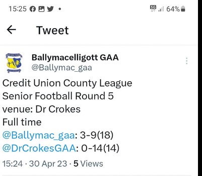 The Credit Union SFL: Division 1 Round 5. Dr Crokes : 0-14 Ballymacelligott 3-09 Seven minutes into the...