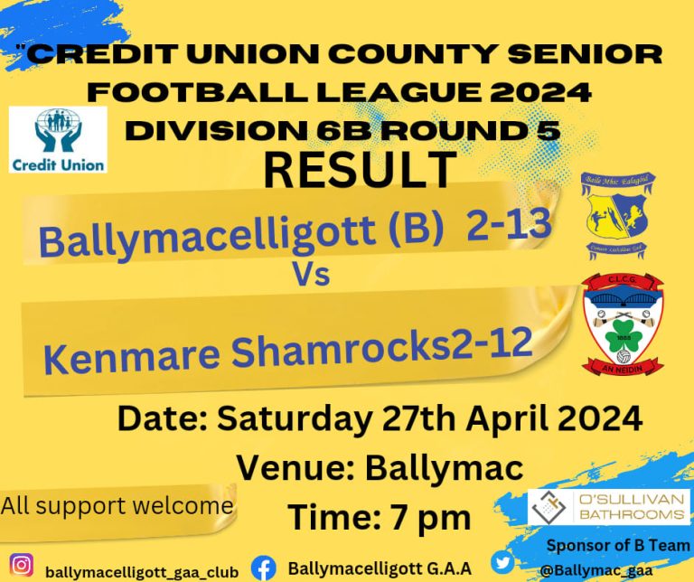 The Credit Union SFL Div 6B Round Ballymacelligott 2-13 Kenmare Shamrocks 2-12 Venue: Ballymacelligott Date: 27th April 24...