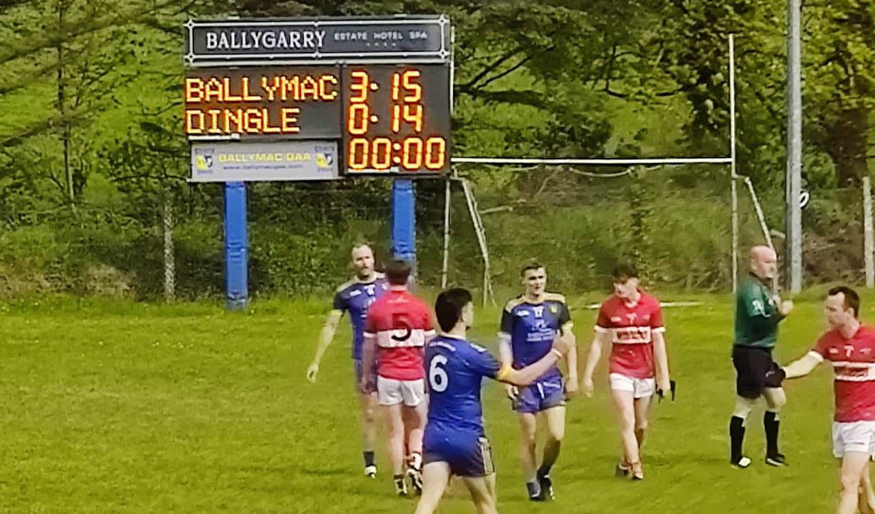 Dingle added to two points from Conor Geaney one from a free, to their tally before halftime. Ballymac saw another goal from Donal Daly and points from Aidan Breen, and Dara Keane (2) giving them a good lead at halftime.
